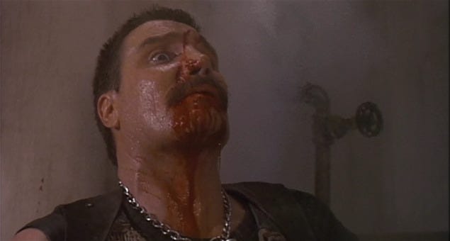 “Let off some steam, Bennett,” sneers a shirtless and battle-face-painted Arnold, triumphant, posing like he's back on Venice Beach outside Gold’s Gym.
